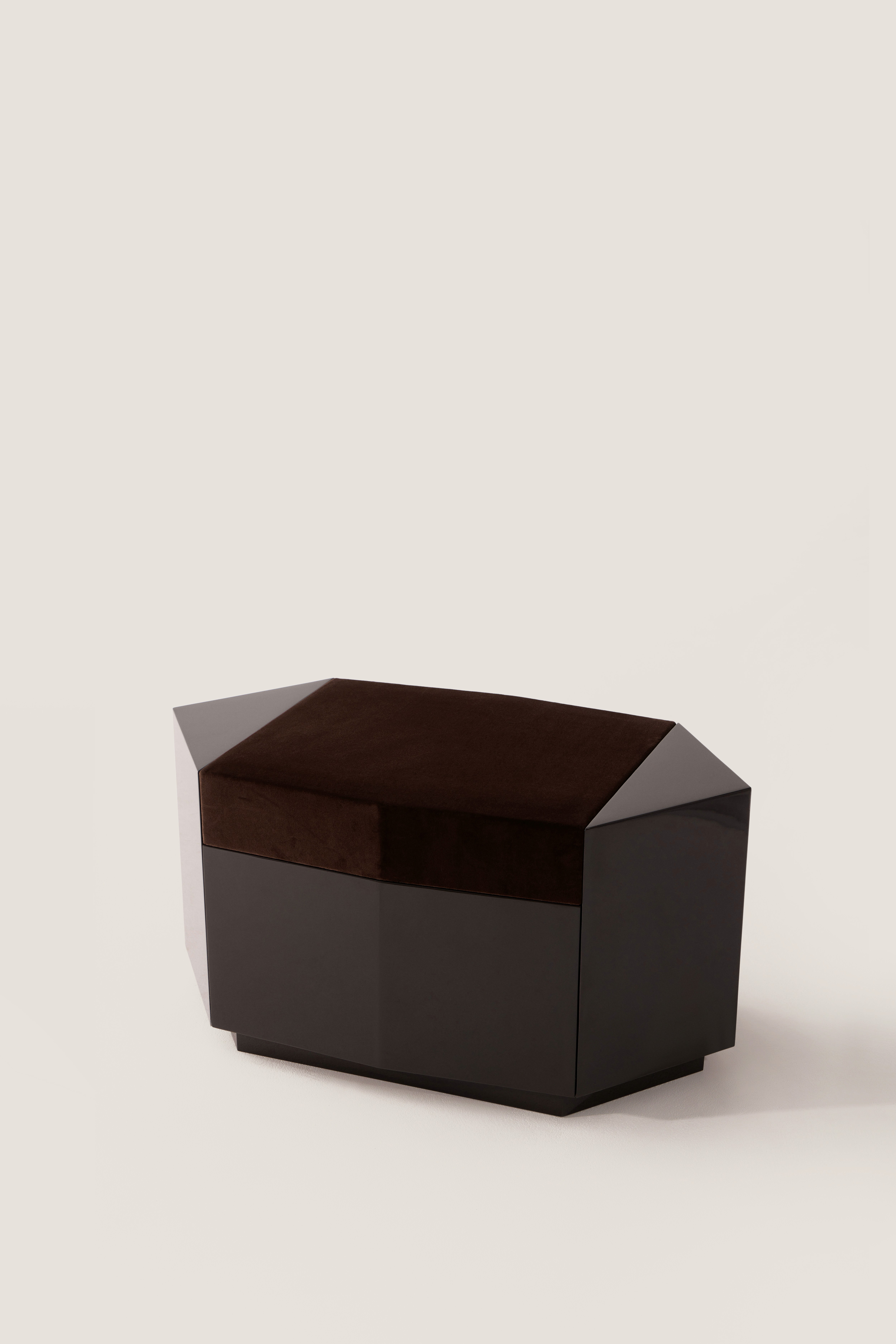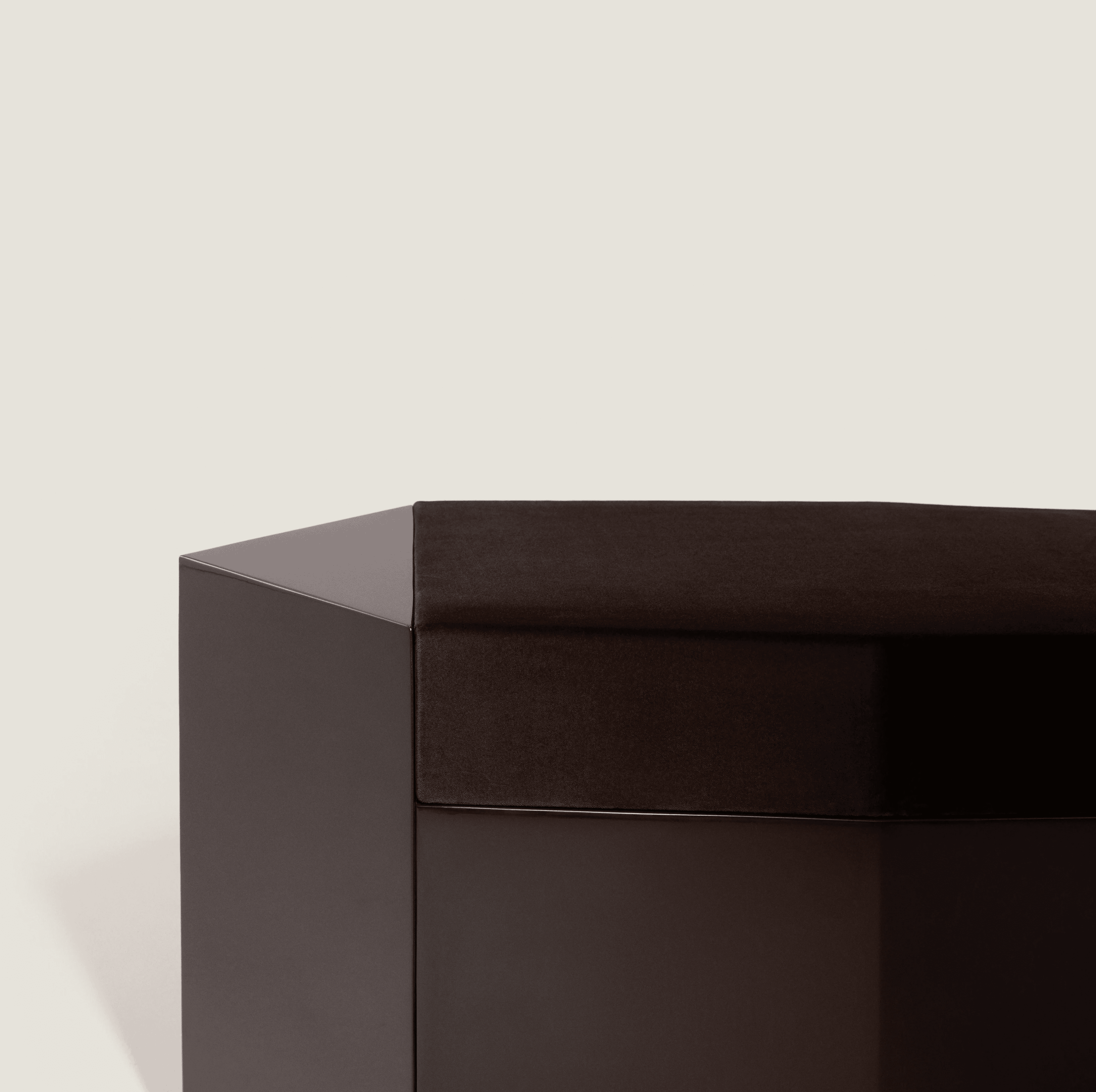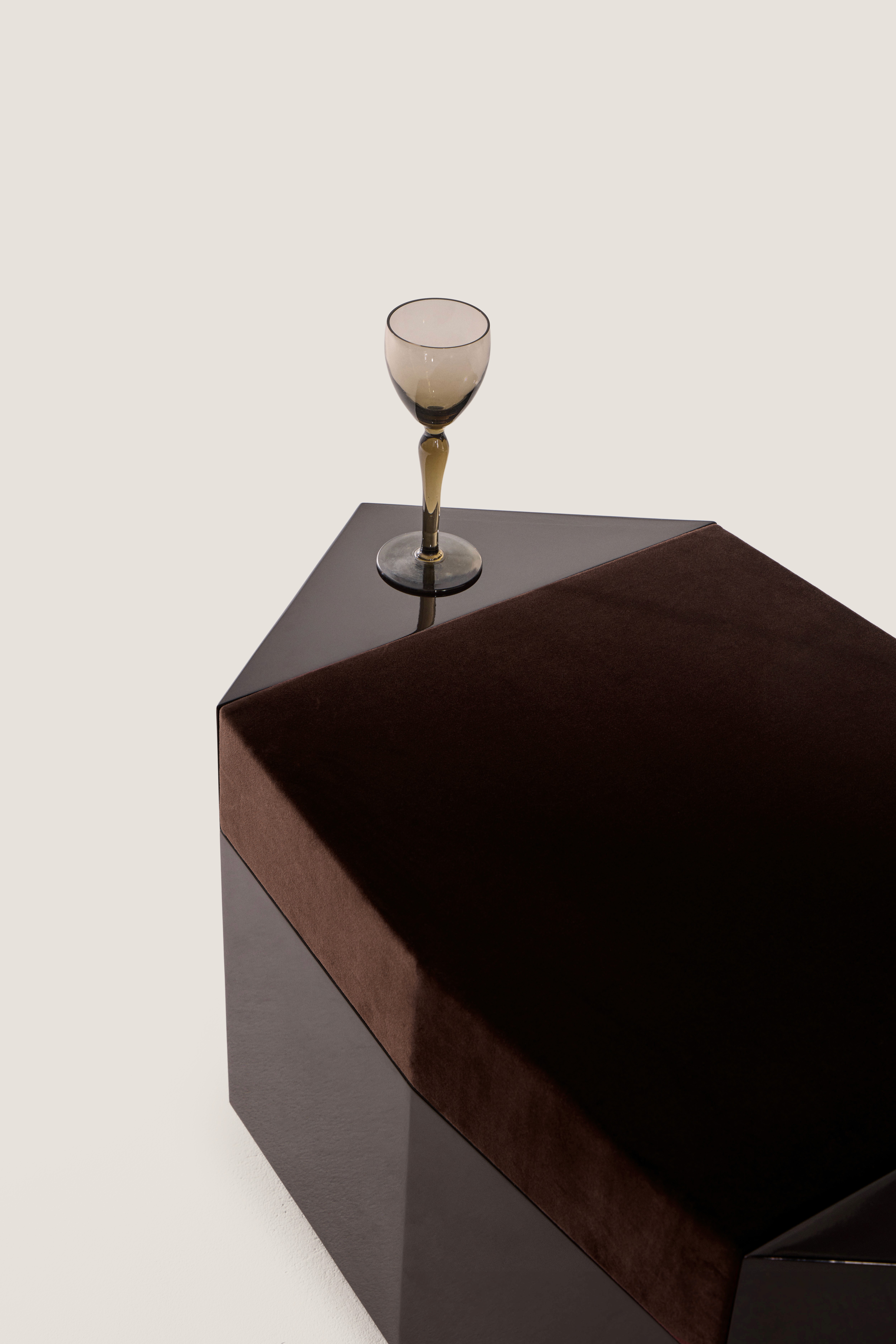 Dark chocolate glossy lacquered MDF and seat in velvet deep burgundy