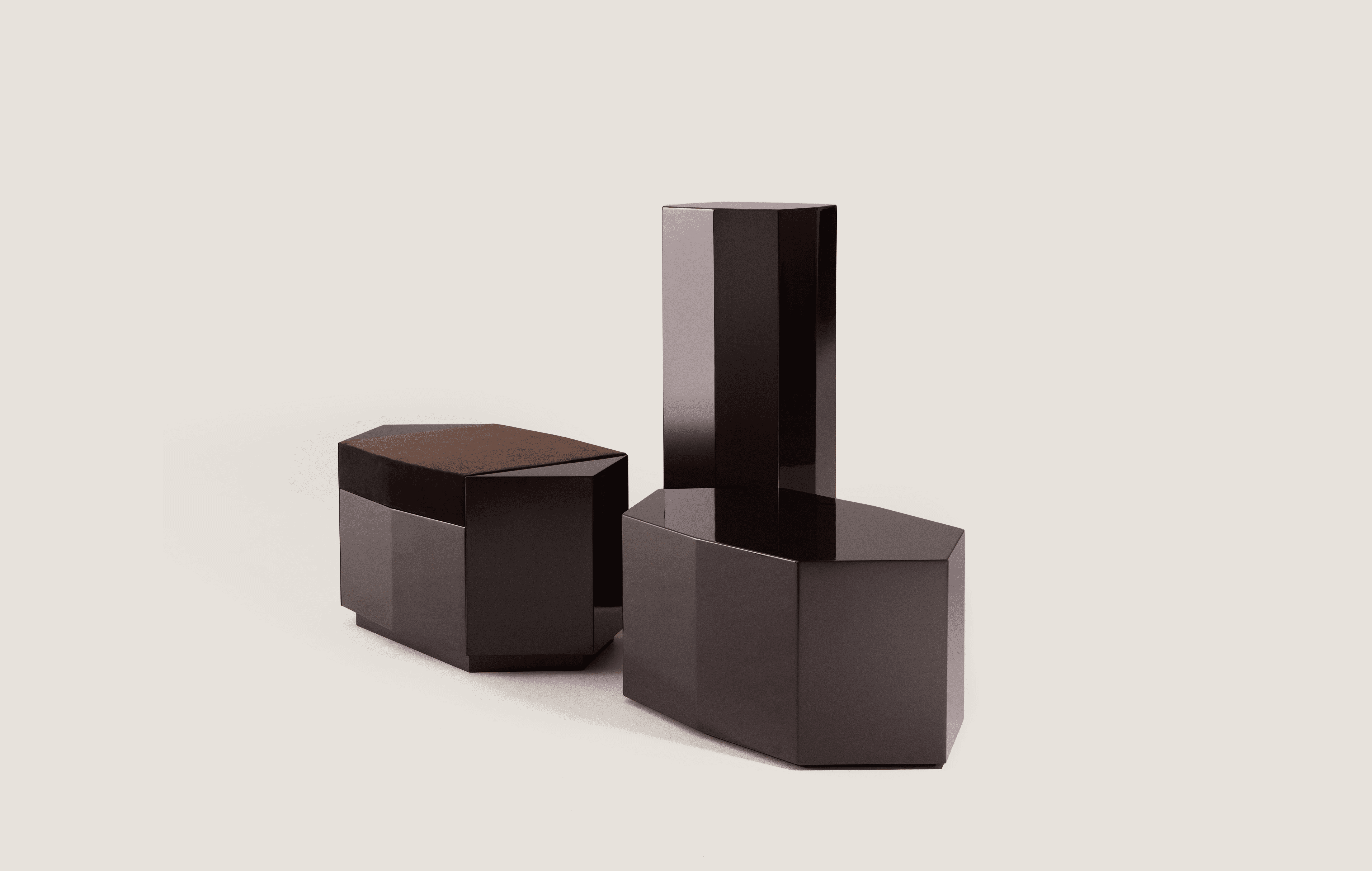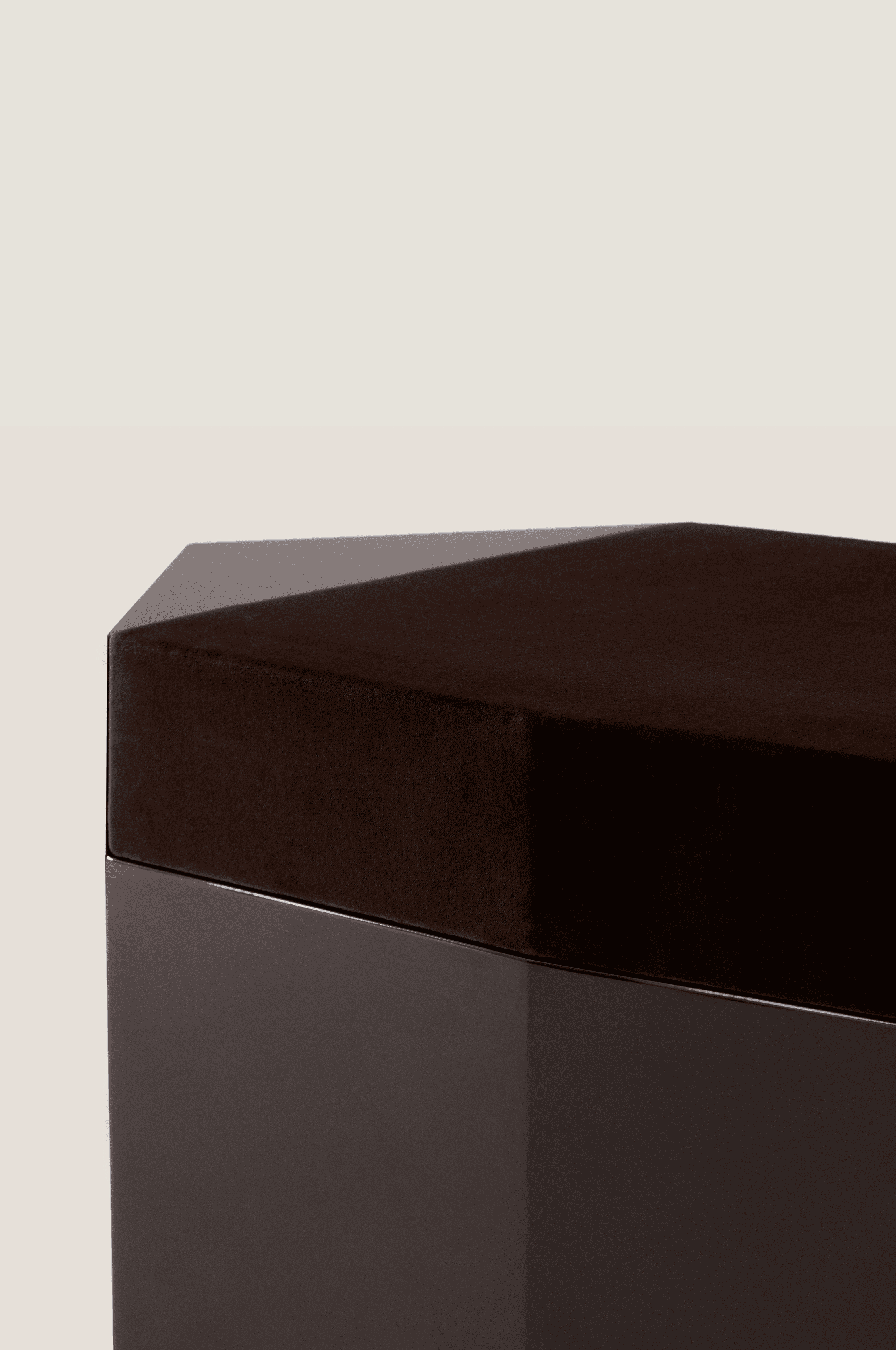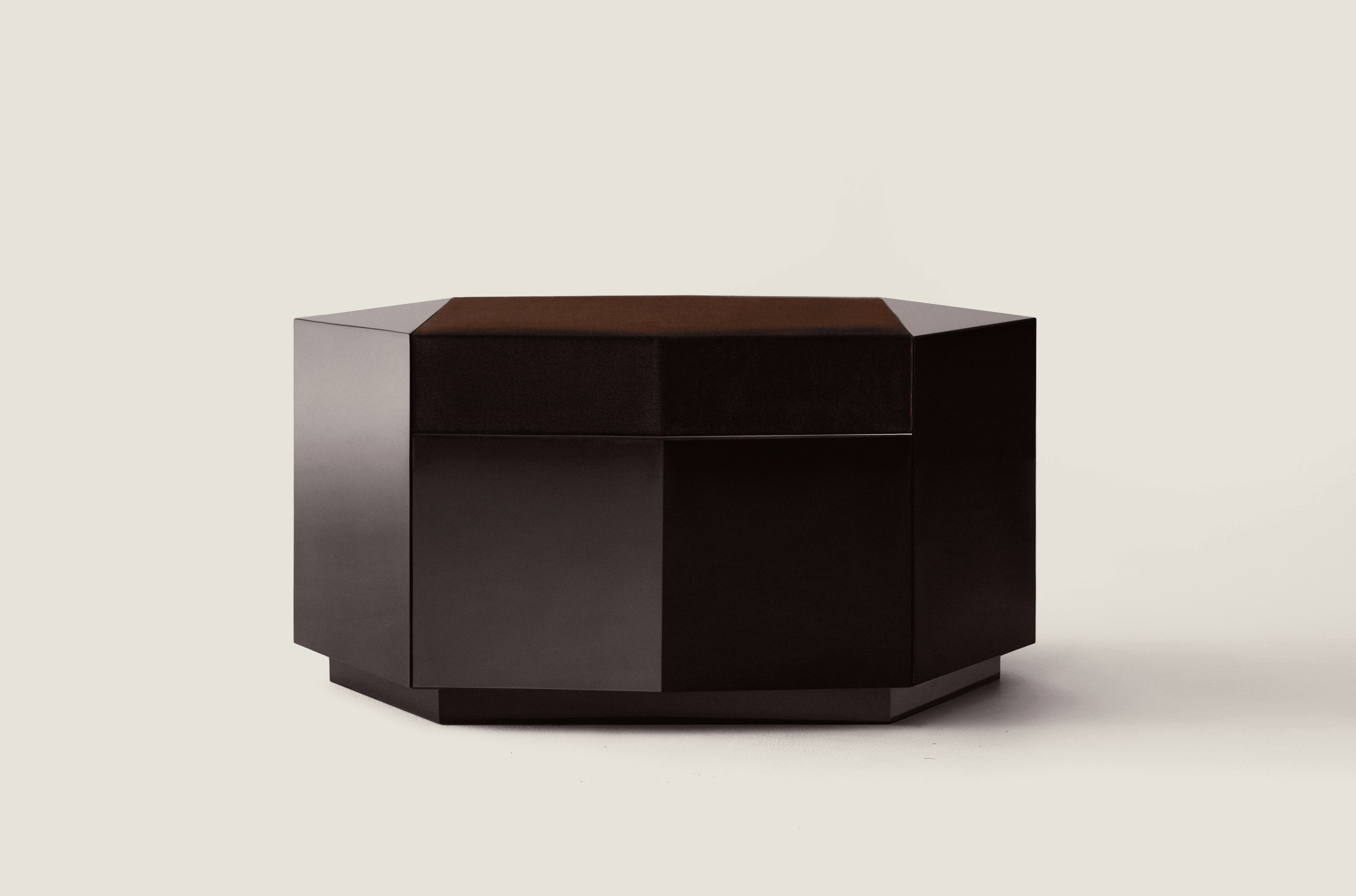 Dark chocolate glossy lacquered MDF and seat in velvet deep burgundy